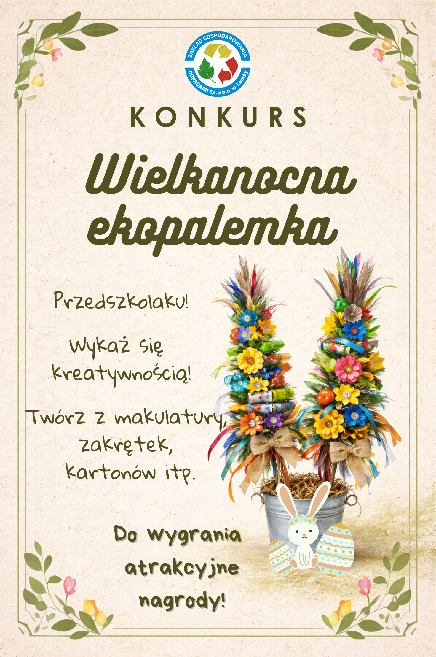 Zakład Gospodarowania Odpadami Sp. z o.o. zaprasza łomżyńskie przedszkola do udziału w wyjątkowym konkursie ekologicznym dla dzieci w wieku 3–6 lat! 💚To doskonała okazja, by połączyć wielkanocną tradycję z edukacją ekologiczną i kreatywną zabawą!